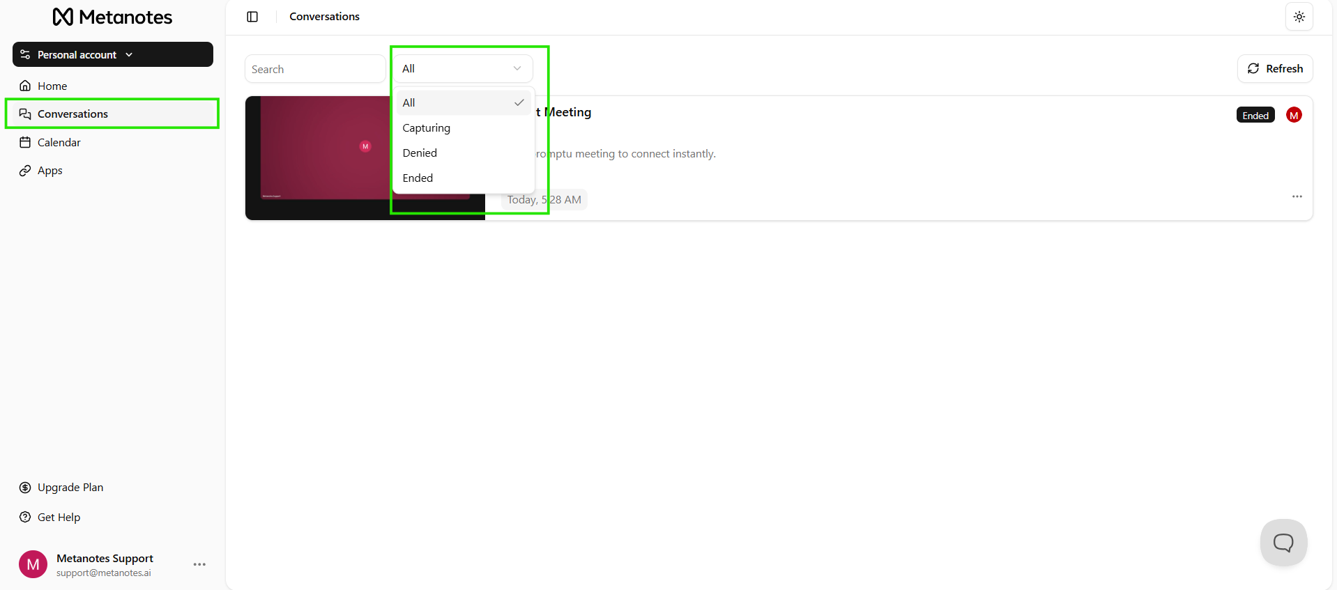 In the Conversations tab, you can easily filter meetings by their status to quickly find the one you're looking for. Choose from these options: