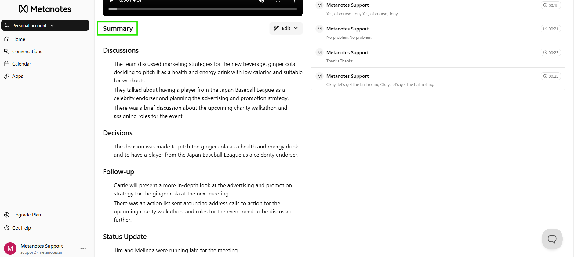 In addition to the summary and transcript, you can also watch the meeting video directly on the same page. The video gives you the context of the meeting while you review the notes.