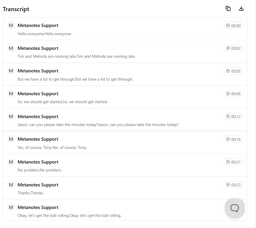 - Time Stamps: Each line in the transcript is linked to the time it was spoken in the meeting, making it easy to jump to relevant sections.